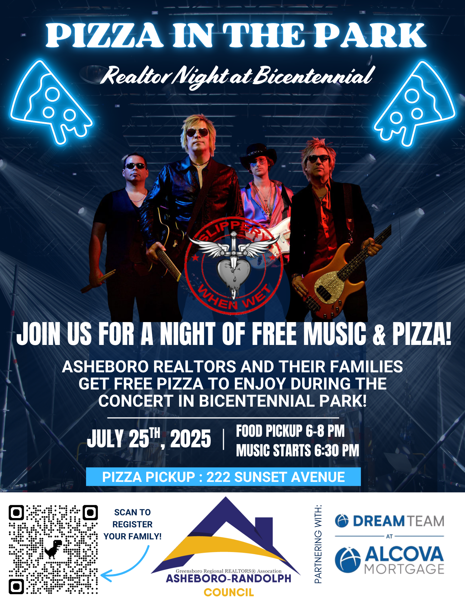 DESCRIPTION:Join us for a Night of Free Music & Pizza!Asheboro REALTORS and their Families get free Pizza to Enjoy During the Concert in Bicentennial Park.Food Pickup: 6-8 PMMusic Starts: 6:30 PMPizza Pickup - 222 Sunset Ave.